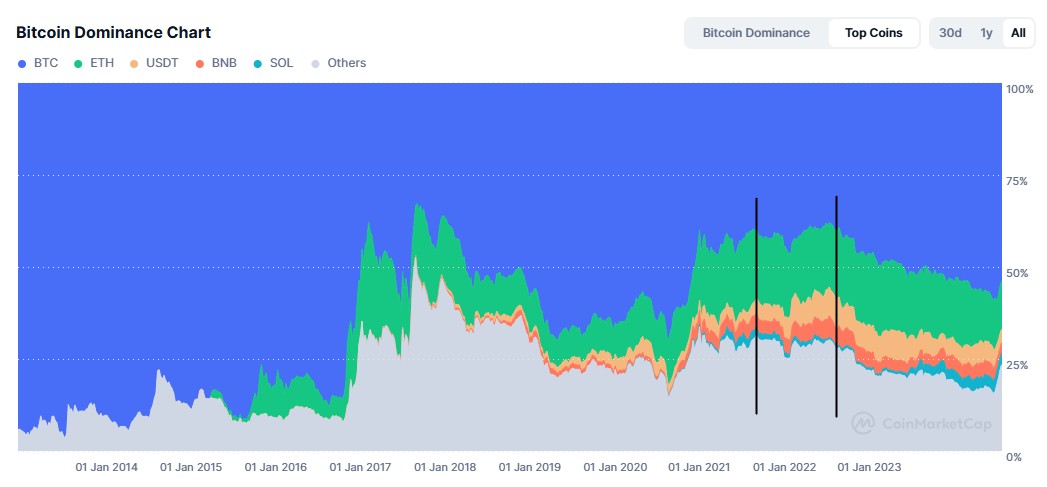 Sin embargo, otra cosa es notable: mientras que la dominancia de bitcoin aumentó del 40% al 70% durante el mercado bajista de 2018-2019, durante el «Criptoinvierno» (marcado por las verticales negras a continuación), la cuota de BTC no superó el 50% (que se muestra con el fondo azul).